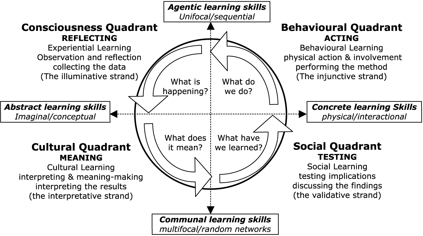 There is also an important principle to consider here relating to the enactive view of cognition (Varela, Thompson, & Rosch, 1991). This enactive cognition can be summed up as “all knowing is doing and all doing is knowing” (Maturana & Varela, 1988, p. 27), and obviously this brings us back strongly to the central role of AAR in an Embodied Foresight perspective. But why I think this is important here is that by giving someone an abstract model or set of tools based on such a model, as is pro- posed with Integral Futures methodologies, we are introducing a new way of doing that can lead to a new way of knowing. This intellectualisation can be a very impor- tant stepping stone towards the embodiment of Integral Futures principles. This always reminds me of the famous quote attributed to Buckminster Fuller: “If you want to teach people a new way of thinking, don't bother teaching them. Instead, give them a tool, the use of which will lead to new ways of thinking”
